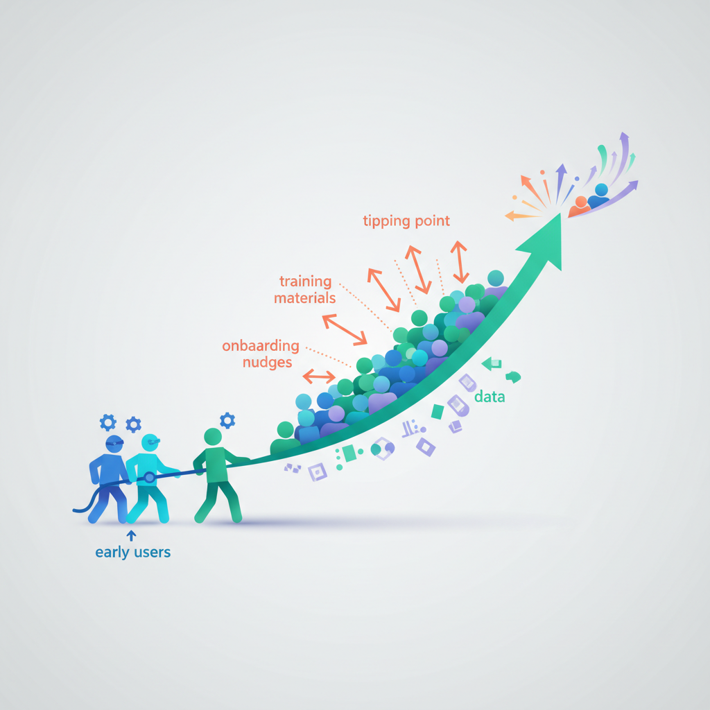 - Growth phase (months 2-6) — Consistent communication and channel redirection increase adoption to 50-70%